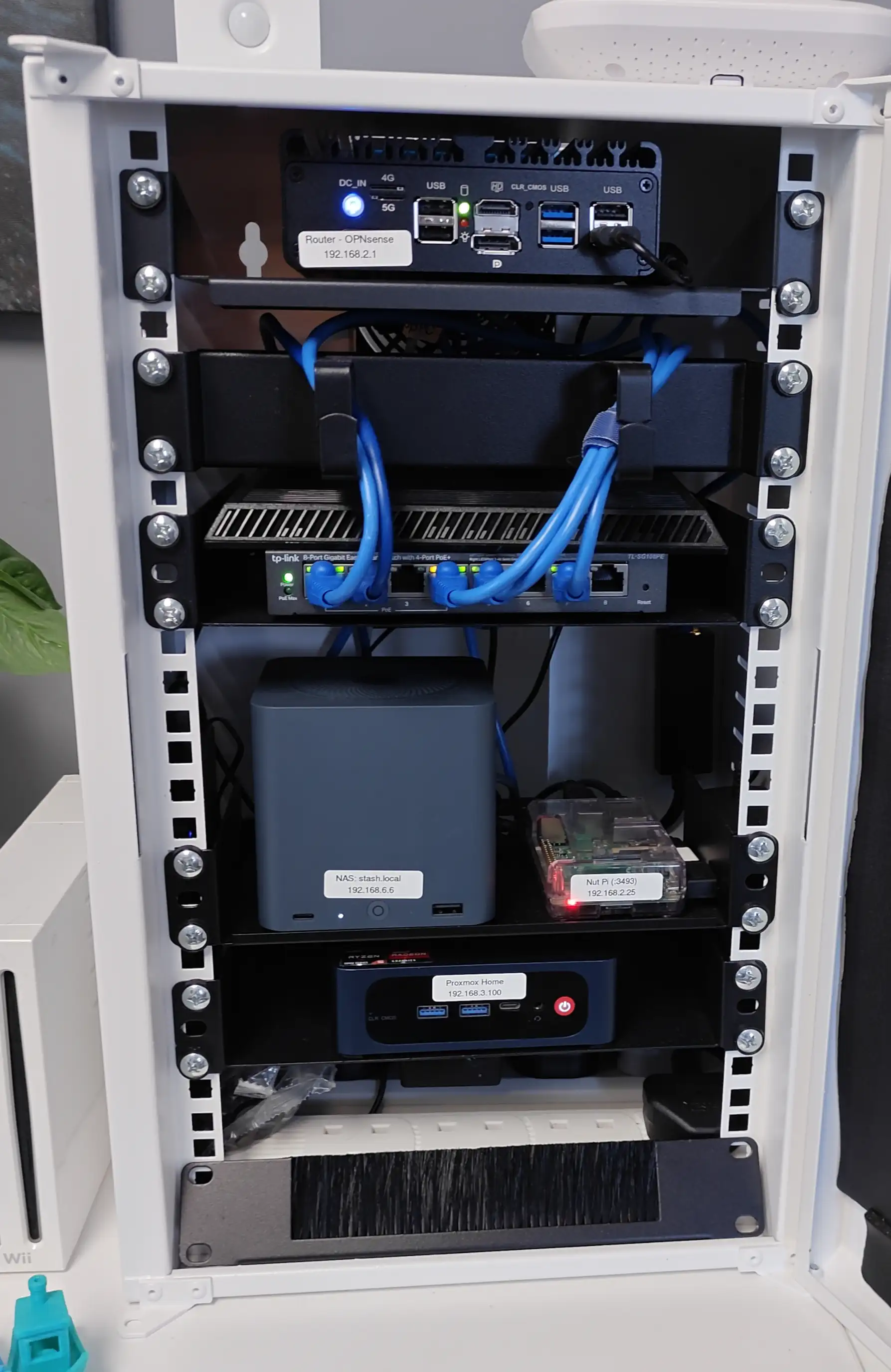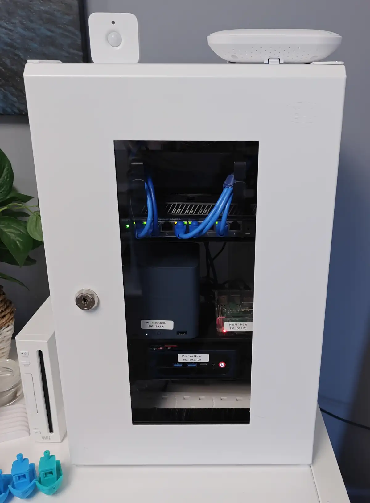 Last year I became aware that 10" mini server racks were a thing. While I think the more open-frame racks look cooler, I went for a more classic rack-style, with a door to be a bit neater overall and to help retain some noise since it sits close to where I work.